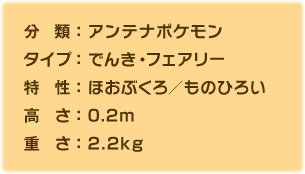 丸いシルエットが特徴的な、でんき・フェアリータイプのポケモン。