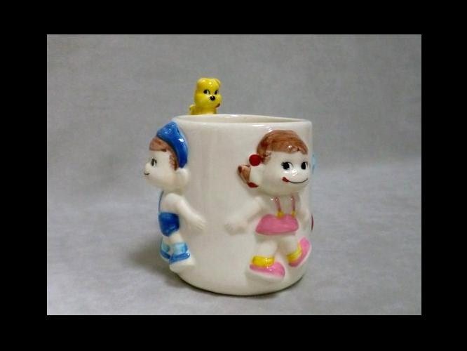 陶器製 不二家 ペコちゃん・ポコちゃん・犬がカップの中の骨を覗いています!