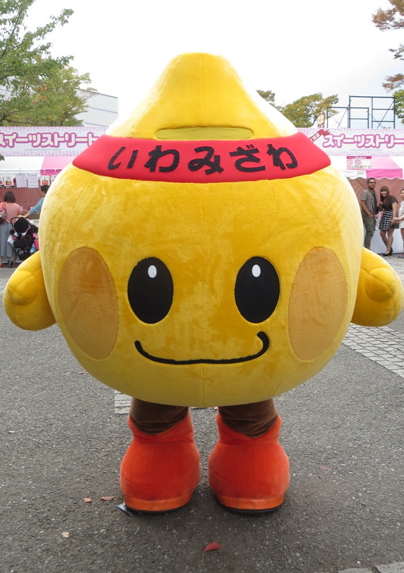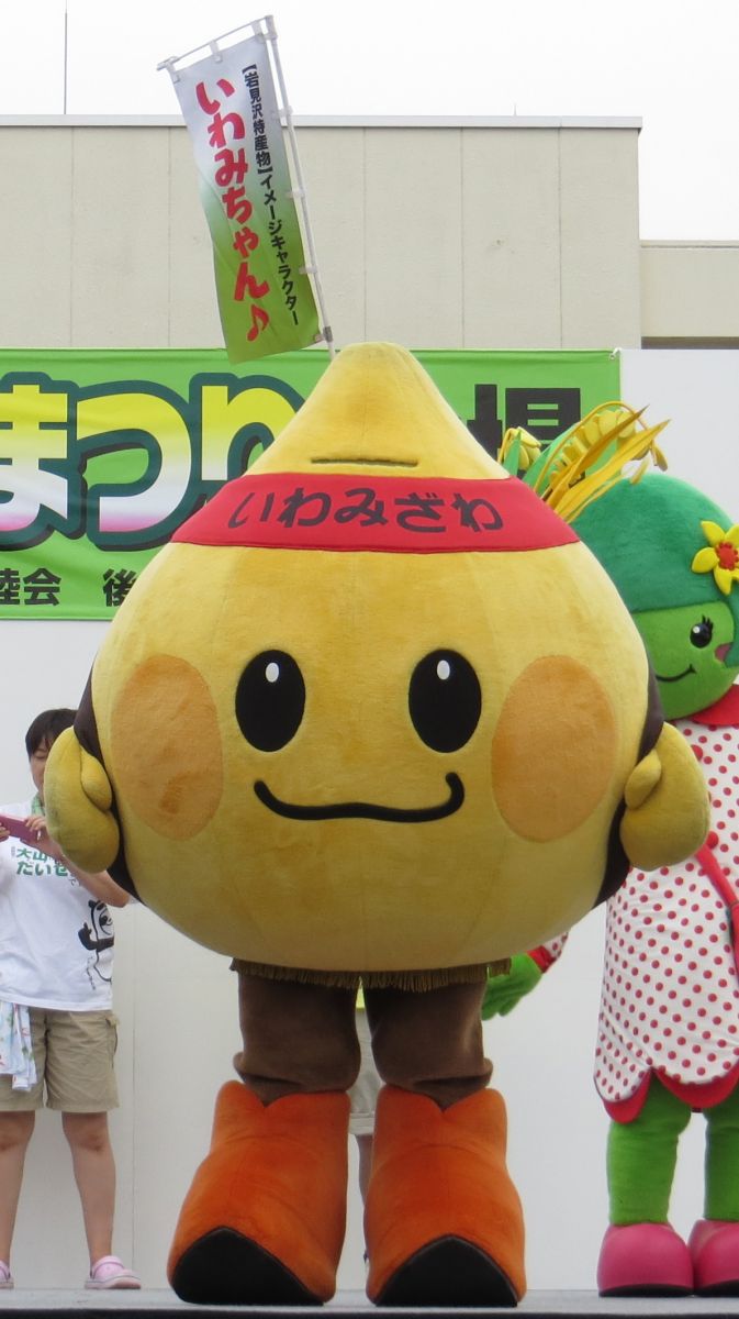 | 平成22年10月3日誕生。 鉢巻を巻いた玉ねぎが大きなかごを背負って日本一の作付面積と収穫量を誇る水稲をPRする姿がいじらしく、鉢巻の「いわみざわ」の文字から「いわみちゃん♪」と名付けられた。 |