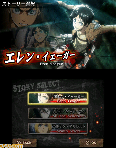 ▲本作のモードのひとつが、物語を追体験できるストーリーモード。最初はエレンしか選べないが、ゲーム10+ 件を進めると、ミカサやアルミンも操作できる。今回の写真に登場しているのは、エレン、ミカサ、アルミンのみ。リヴァイなどの存在も気になるが……!?