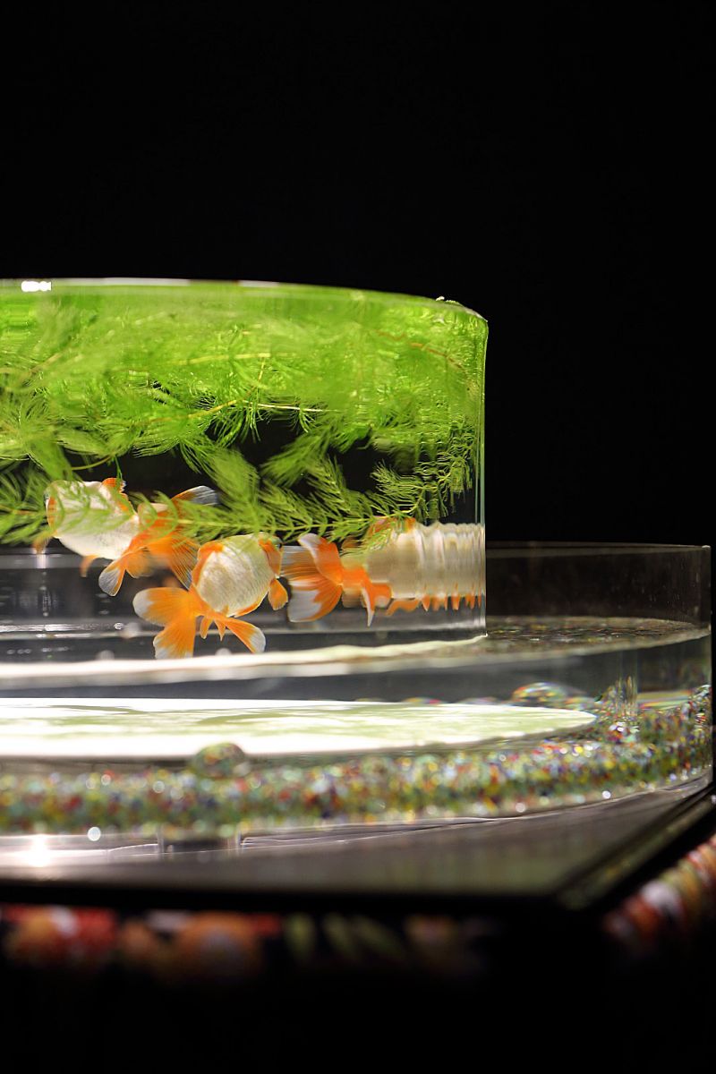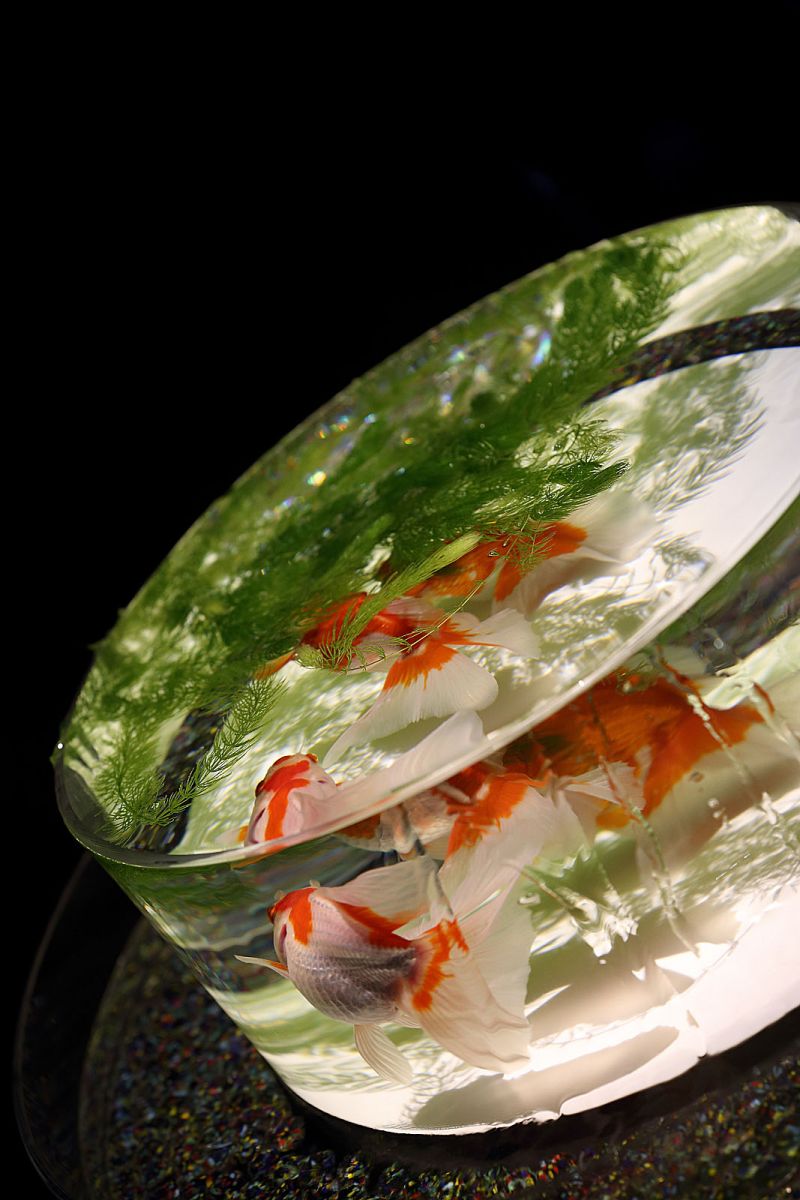1は縦撮り、水槽を半分に切り離した撮影、2は斜めから、3は金魚の遊泳する躍動感も表現させています。
