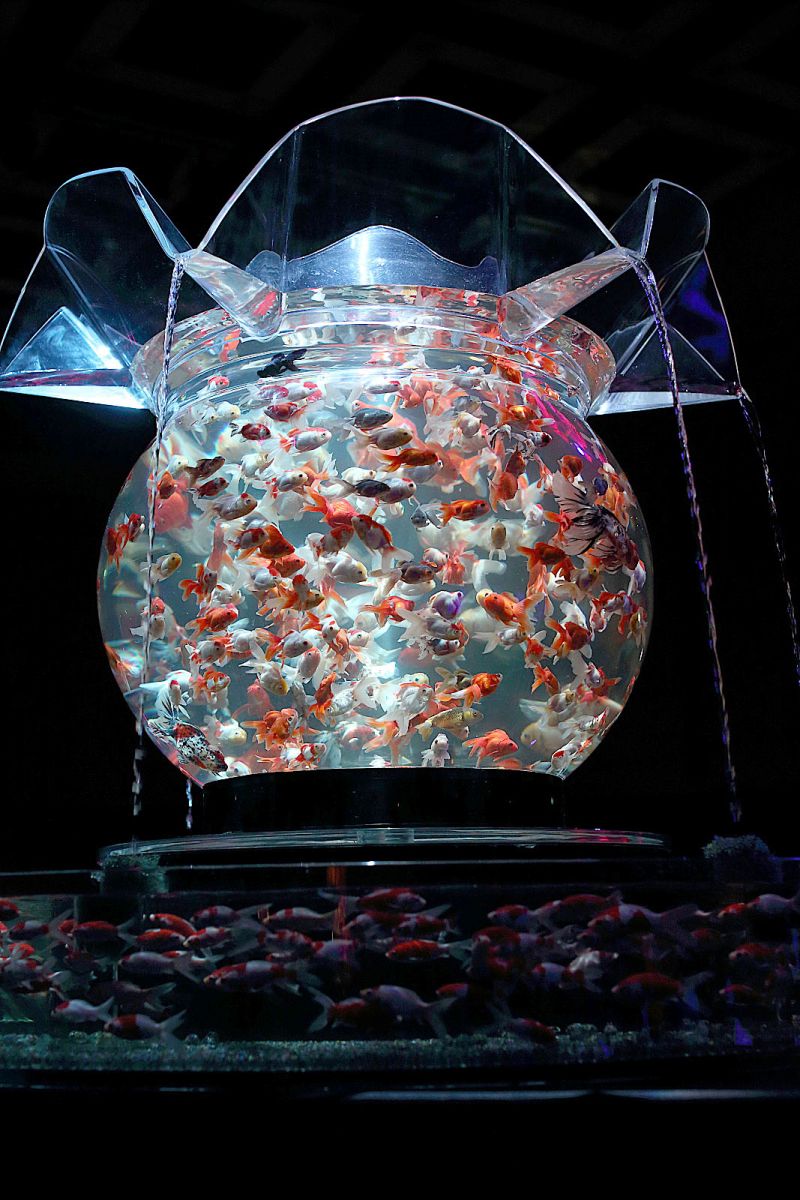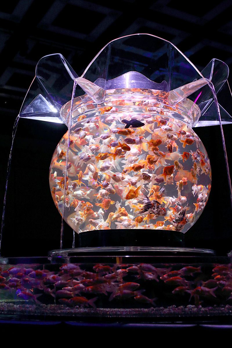 作品名は「花魁」水槽は上と下に分かれており、下部が花魁になりたい多くの女人たち。上部の水槽の中には華やかな金魚、すなわち花魁。その中に一際大きな金魚がいます。これが花魁の中の花魁といった表現だそうです。