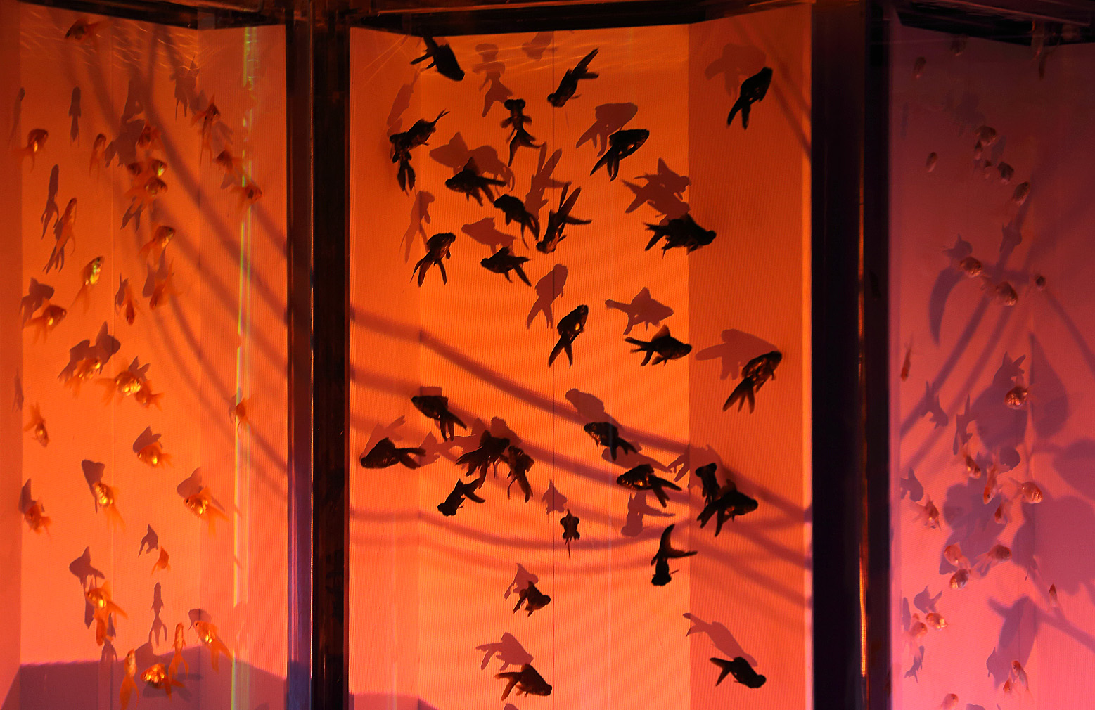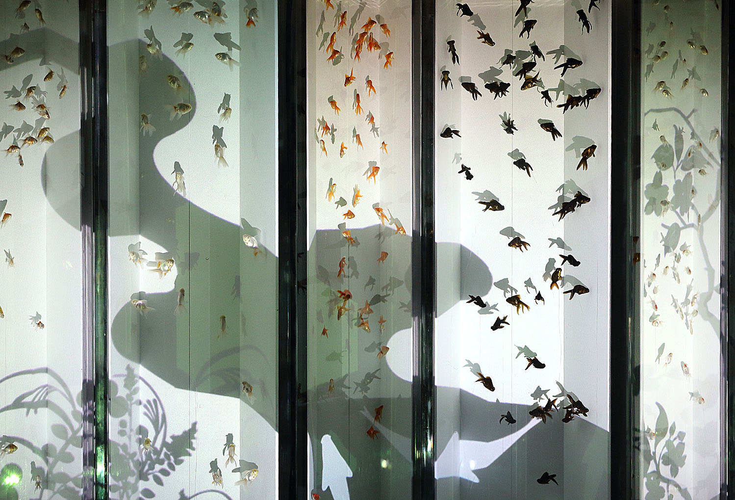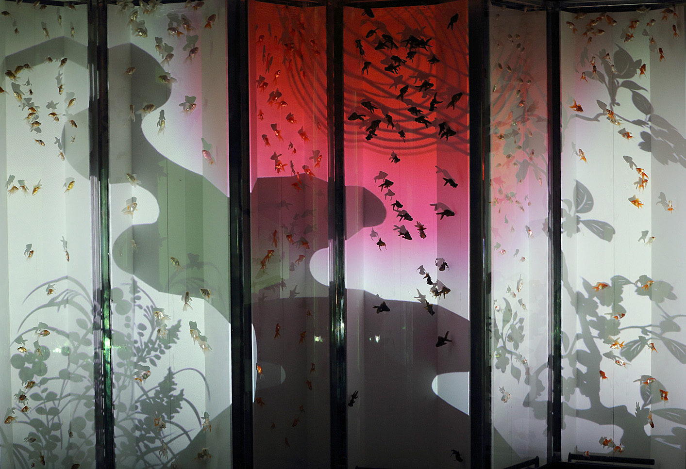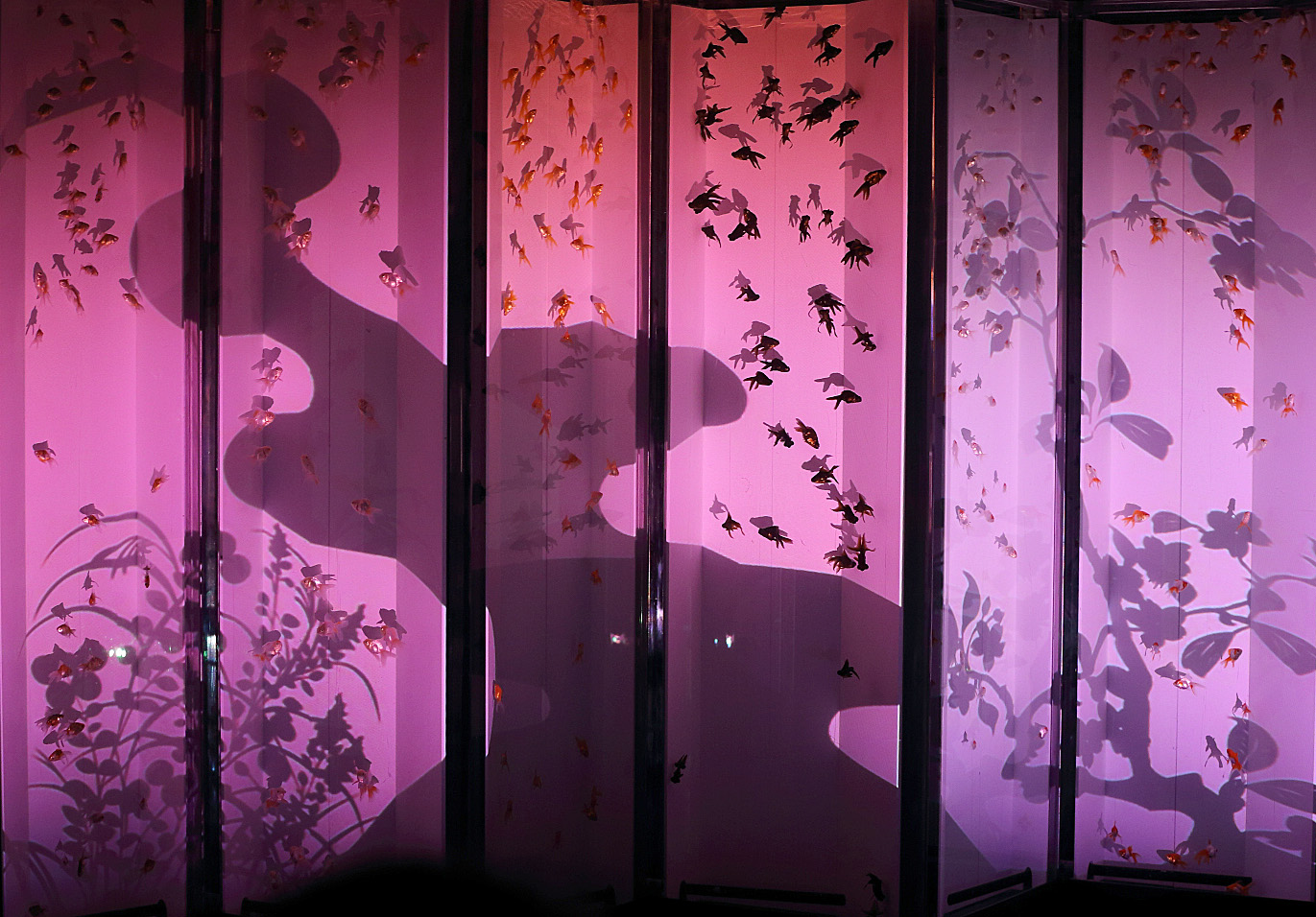 屏風水槽、これは綺麗ですね。屏風の手前がわに薄い水槽を設けて金魚を泳がせてアートにさせている。すごいですね。