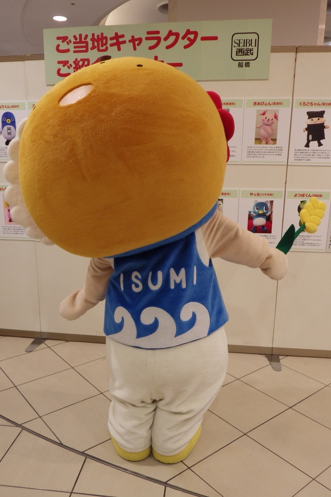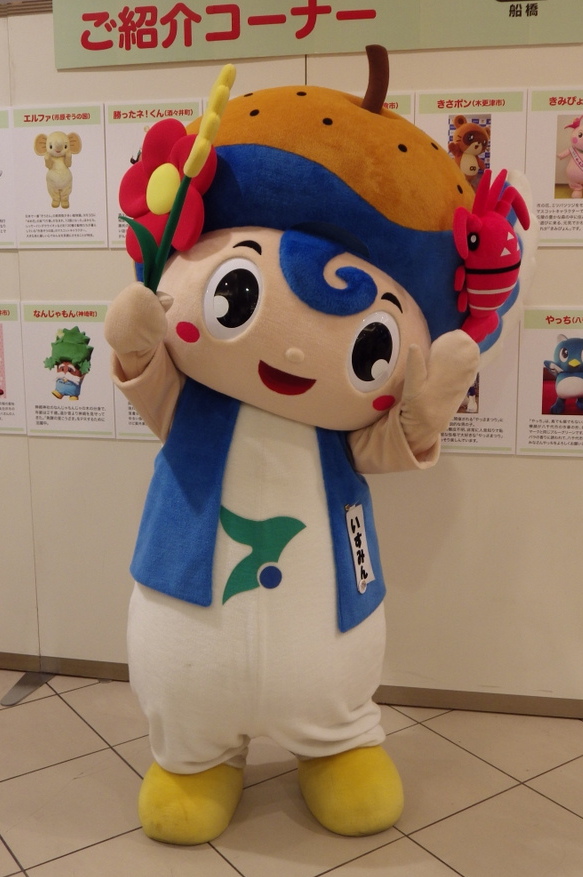 | 2013年2月誕生。 いすみ市特産の梨の帽子をかぶり、髪はいすみ市に多くの作品の残る江戸時代の彫り物師「波の伊八の波」・「千葉県外房の海」をイメージ。 頭には全国トップクラスの水揚げ量を誇る夷隅漁協の「伊勢海老」といすみの冬の風物詩「椿」のアクセサリー。 手には千葉県の3大米のいすみ米の稲穂を持っている。 一見男の子のようだけど女の子。いすみ市の営業課長もつとめている。 |