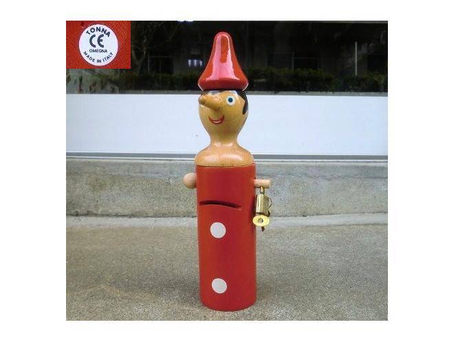 イタリア製 木製 ピノキオ 貯金箱 鍵付き 検:木製玩具