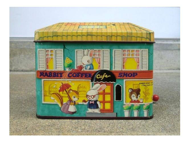 レトロ ブリキ缶 小物入れ Rabbit Cofee Shop Sankyo サンキョー 手動のオルゴール 日本製 完動品!