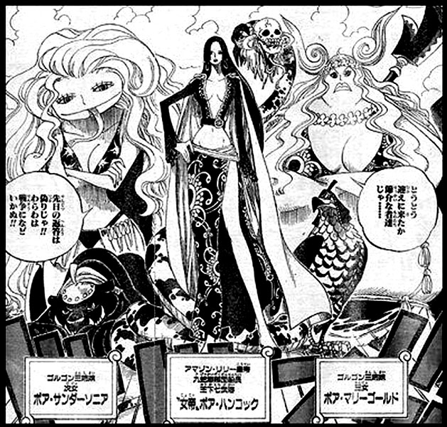 ニョン婆様は アマゾン・リリー先々々代皇帝「グロリオーサ」という方でした。ハンコックが七武海の称号を剥奪され アマゾン・リリーが ただの海賊国家になれば惨劇を生むと、ハンコックに戦争へ行くように説得しますが聞き入れられず、窓から投げられてしまいました。でも無事!九蛇は全体的に強そうですねー!