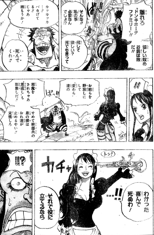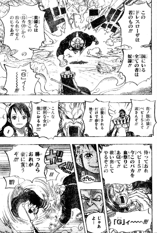 ドレスローザにいる全ての者は奴隷、ベビー5は必要とされるだけで命をも捨てる便利な女だから渡さないと言い、ラオGはサイに攻撃を仕掛けます!便利と言われ涙を流すベビー5!じゃあ勝ったらおれが妻に貰うとサイは言い、ラオGに錐龍錐釘!!ベビー5は胸キュン!ラオG脱落!ベビー5恋落!サイ格好良すぎますね!可哀相な境遇で育ったベビー5が、利用するのが目的の求婚者や、それを暴力で排除するだけだったドフラミンゴなどとは違う、いい男と結婚できそうで良かったですね!