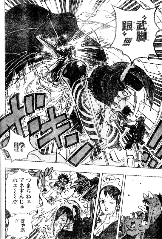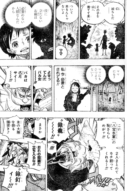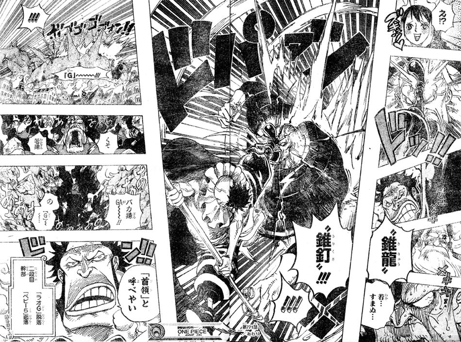 ラオGの、腰痛の構えからの目の突枯、型氷、不死武士の痛己などの地翁拳を受けつつ、サイとベビー5の結婚に反対だと言う首領チンジャオ!ベビー5はサイに結婚しねェと言われ驚きます。サイは二宝水軍棟梁の娘ウホリシアという許婚との政略結婚でも嫁なんざ誰だっていいと言います。