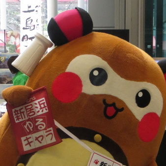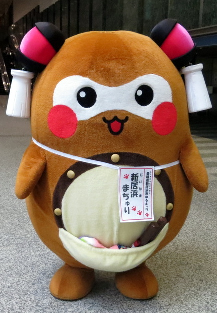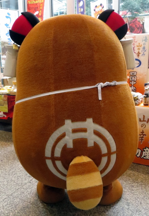 | 一宮神社の「小女郎狸伝説」をモチーフに2013年に誕生。新居浜の太鼓まつりなどをPR。 おっとりしているけど頑張り屋の女の子。後ろは、可愛らしい尻尾と、新居浜の市章があしらわれている。お腹のポケットには太鼓の鉢とお手玉。耳飾りには、太鼓台の「くくり」&「房」。くくりの伊達巻きは新居浜市の市花である「つつじ」をイメージしている。 |