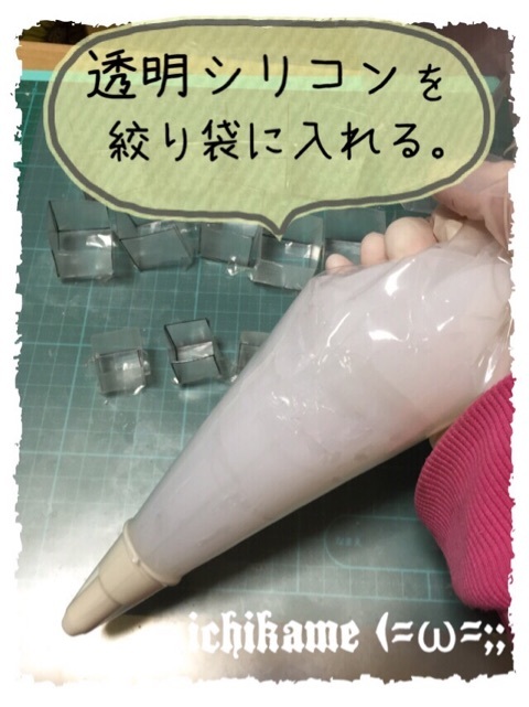 これを百均のクリーム絞り袋に入れ、ケーキのクリームを絞る要領で型に流し込みます。