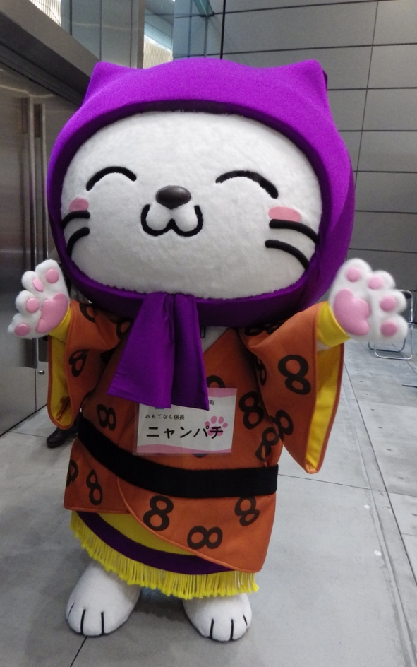 | 2013年12月デビュー。 秋田県指定無形民俗文化財の「願人踊(がんにんおどり)」の手つき腰つきが、ネコの 踊りと重なって突如現れたキャラクター。八郎湖のワカサギが好物な元気な男の子。いつでもほっこりエビス顔がチャームポイント。 |