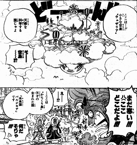 そして麦わらの一味の3人が登場!ナミは小さな空島“ウェザリア”、フランキーは“からくり島”未来国バルジモア、サンジは夢の島“モモイロ島”カマバッカ王国に飛ばされていた!!