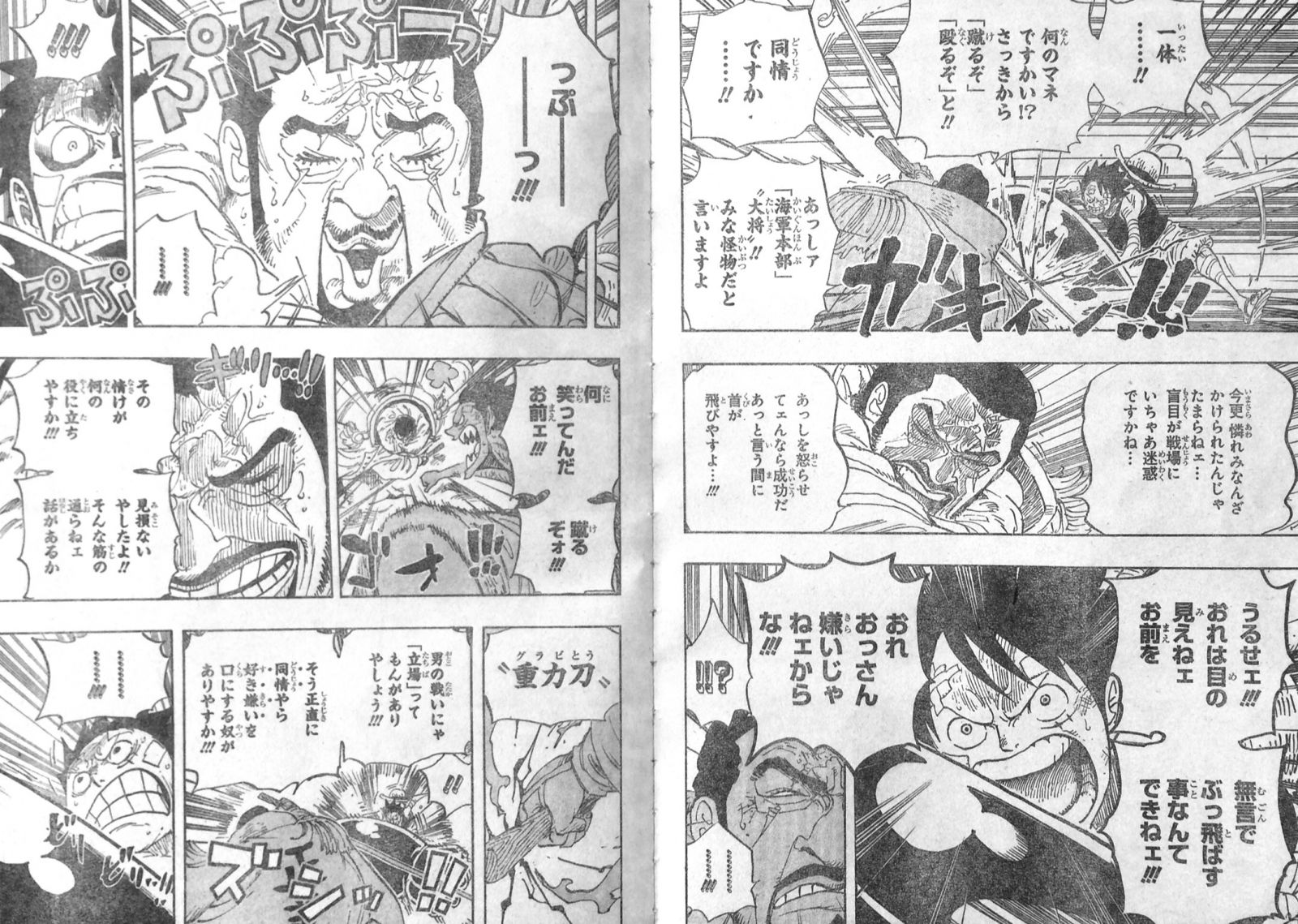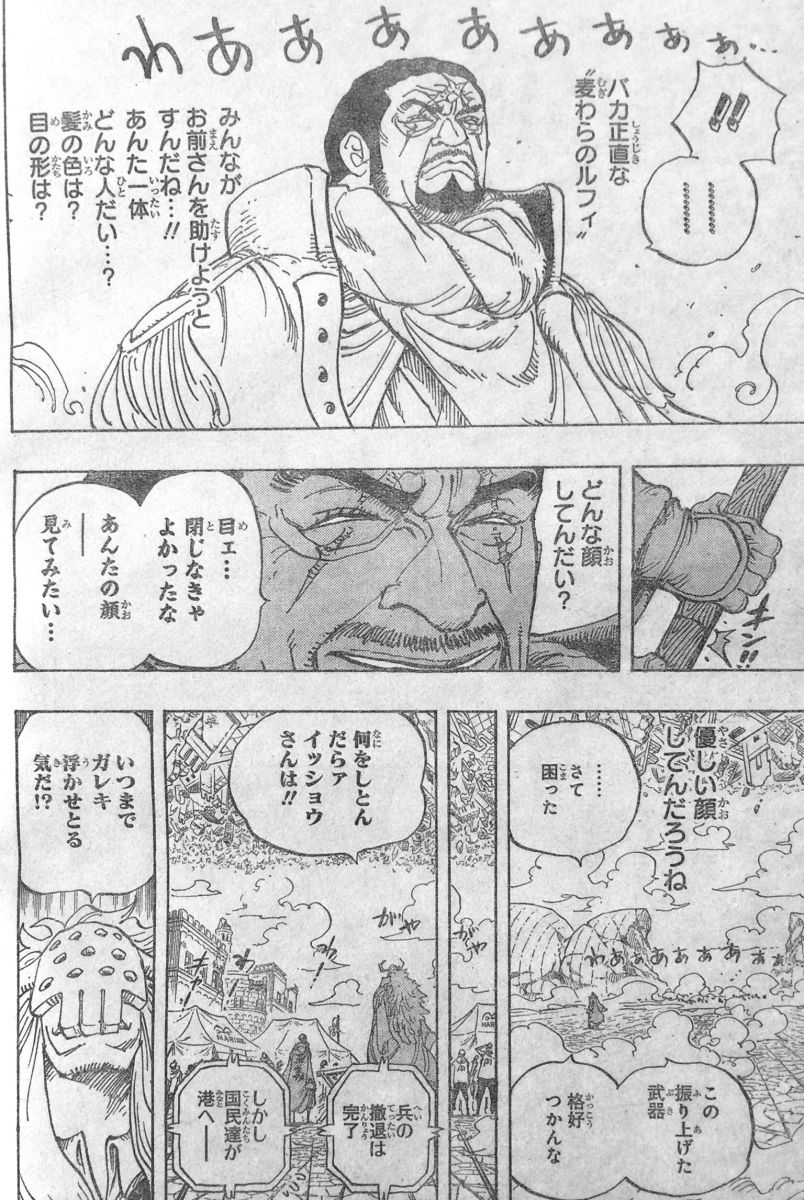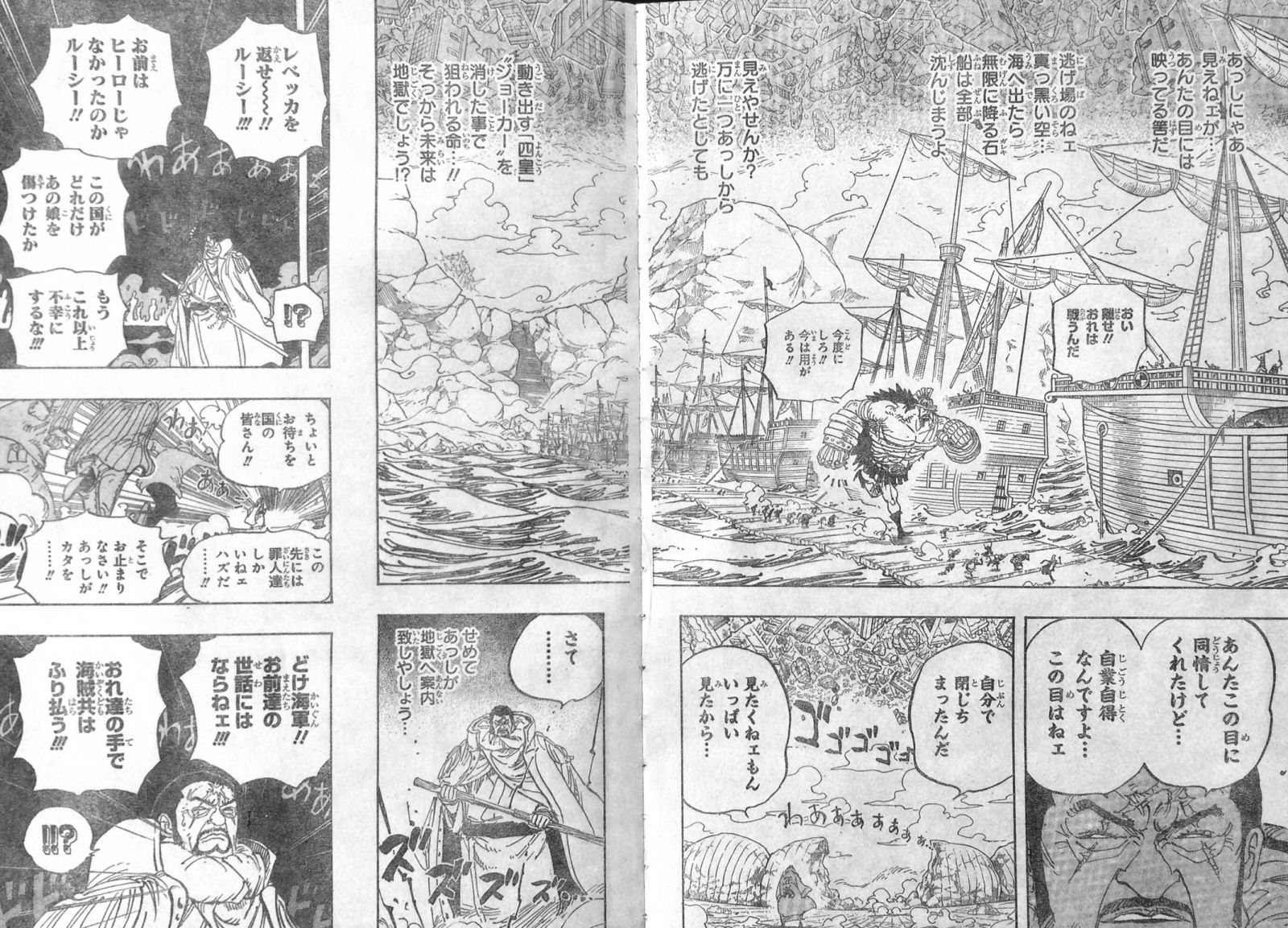 藤虎に予告しながら攻撃し続けるルフィ!盲目の自分への同情かと怒る藤虎に、目の見えないお前を無言でぶっ飛ばす事なんてできない、おれ おっさん嫌いじゃねェからなと言うルフィ!藤虎は吹き出して笑い、こっちも我慢して立場を貫いていると言い、重力刀 猛虎!吹き飛ばされたルフィは巨人ハイルディンが確保し船へ向かいます!やる気のゾロはバルトロメオが制止!