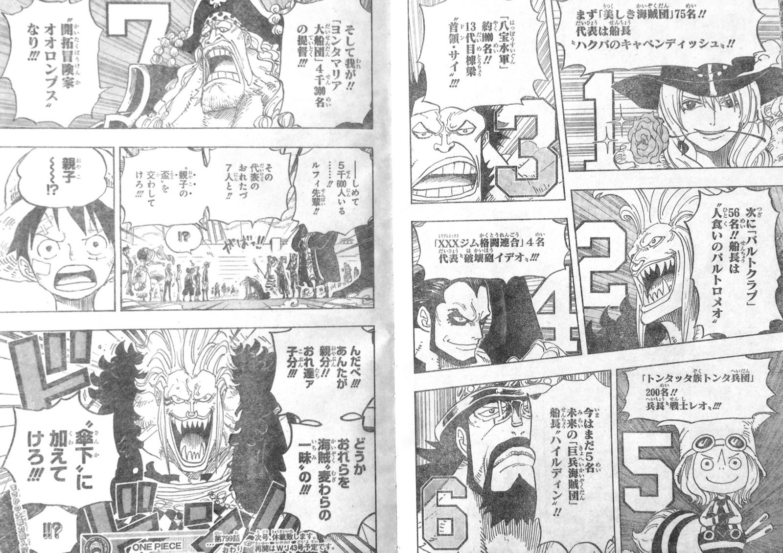 1:「美しき海賊団」75名、船長は“ハクバのキャベンディッシュ”! 2:「バルトクラブ」56名、船長は“人食いのバルトロメオ”! 3:「八宝水軍」約1000名、13代目棟梁“首領・サイ”! 4:「XXXジム格闘連合」4名、代表“破壊砲イデオ”! 5:「トンタッタ族トンタ兵団」200名、兵長“戦士レオ”! 6:未来の「巨兵海賊団」5名、船長ハイルディン! 7:「ヨンタマリア大船団」4300名、提督“開拓冒険家オオロンブス”!しめて5600人!