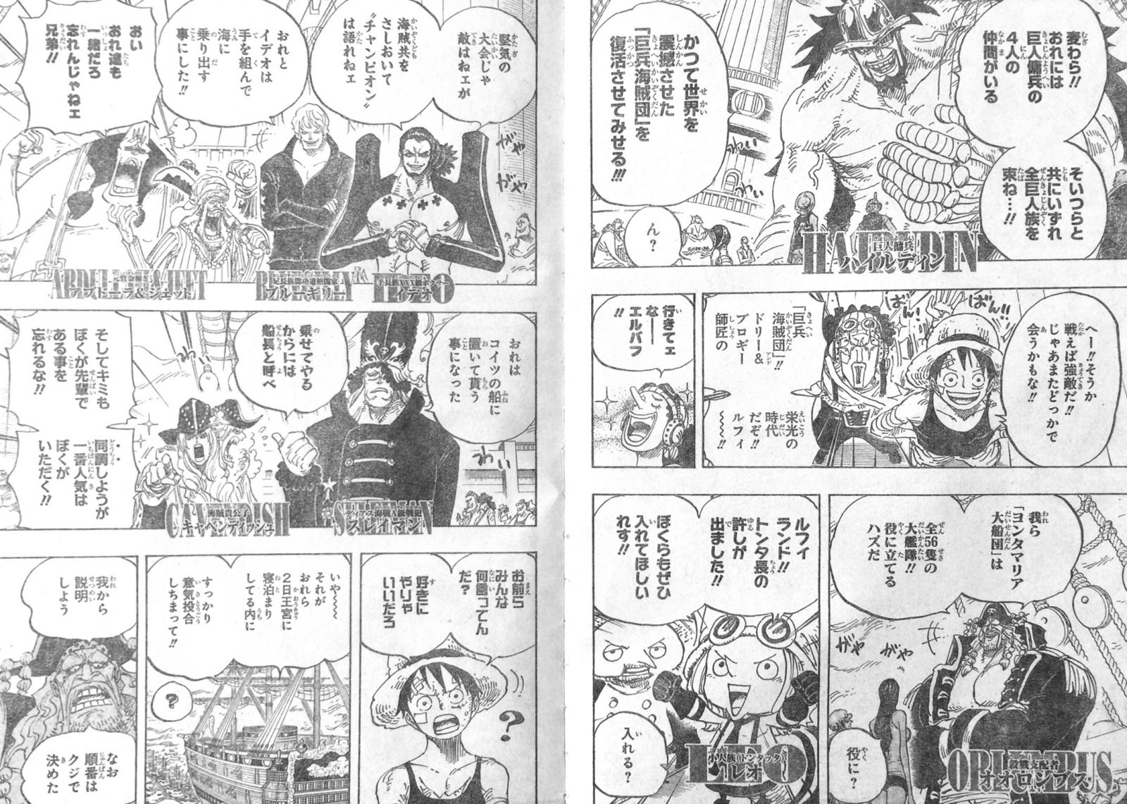 ルフィ達はヨンタマリア大船団 主船ヨンタマリア号に到達!超巨大!巨人傭兵ハイルディン、殺戮支配者オオロンブス、小人トンタッタ族レオ、手長族XXX級ボクサー イデオ、イデオと手を組んだ足長族脚攻道格闘家ブルーギリーと元賞金稼ぎアブドーラ&ジェット、海賊貴公子キャベンディッシュ、キャベンディッシュと手を組んだディアス海戦A級戦犯スレイマンなどの戦士達は2日王宮に寝泊りしている内にすっかり意気投合!