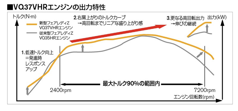 エンジンはVVELの効果で、最大トルクの90%を2400〜7200rpmの広い回転域で発生します。
