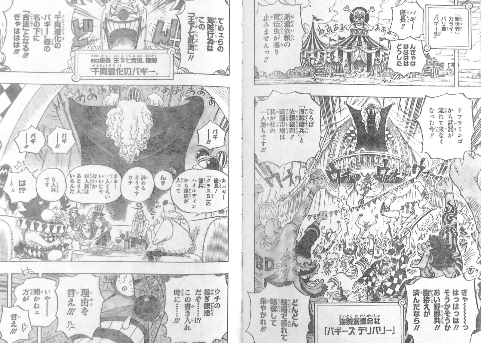 新世界カライ・バリ島“バギー街”にて、海賊派遣会社「バギーズ デリバリー」で儲けている、バギーズデリバリー座長“王下七武海”海賊“千両道化のバギー”!ドフラミンゴの武器密売が無くなり、海賊傭兵の依頼殺到!巨人ハイルディンもクラスSのバギーズ デリバリーの傭兵でしたが、ルフィ傘下になった事により5人揃ってバギーズ デリバリーを辞める事に!理由を聞いたらバギーが怒りそうですね!