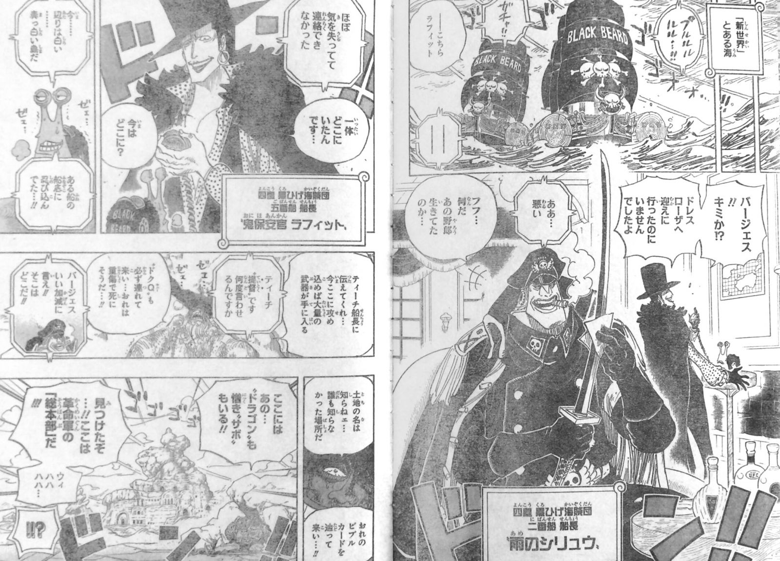 新世界とある海に浮かぶ四皇 黒ひげ海賊団の船2隻!バージェスと電伝虫で話しているのは五番船船長“鬼保安官ラフィット”!二番船船長“雨のシリュウ”も一緒にいます。バージェスは船に忍び込み、真っ白い島で誰も知らなかった場所、革命軍総本部のあるバルティゴに来ていました!重傷で死にそうなバージェスは、ドクQも必ず連れて来い、ここに攻め込めば大量の武器が手に入るとティーチ提督に伝えてくれと言います。革命軍と黒ひげ海賊団がぶつかる事になるのでしょうか!?