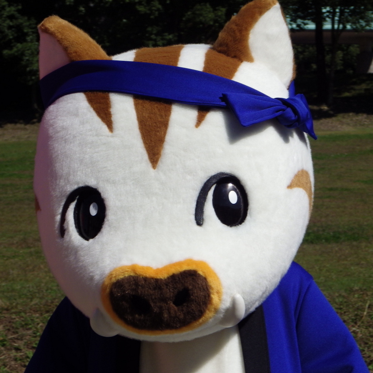 五穀豊穣の神である白猪をモチーフに伊阜岐神社などで行う神事「オコナイ」の青い法被をまとっている。