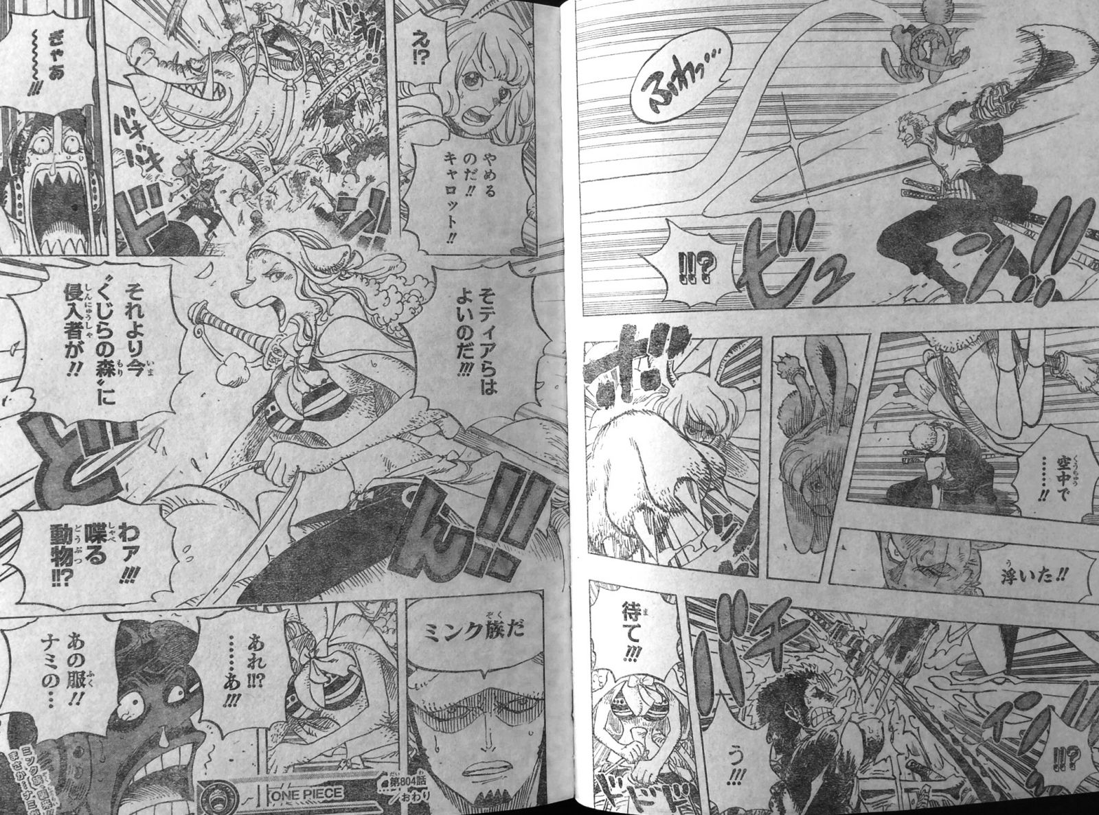 突然襲ってきたのは望遠鏡で監視していた者!兎のような耳と顔、尖った爪のついた手袋らしきものをつけ、服も着て髪の毛もある女性!空中で浮いてゾロの攻撃をかわし、右手の攻撃を剣で止めたゾロは電気のようなものをくらいました!止めに入ったのは大きな猪のようなものに乗った犬っぽい顔の女性!兎っぽい女性はキャロットという名前!これがミンク族!犬っぽい人は、そティアらはよいのだ、それより今“くじらの森”に侵入者が、と言い、ナミの服を身に付けています!