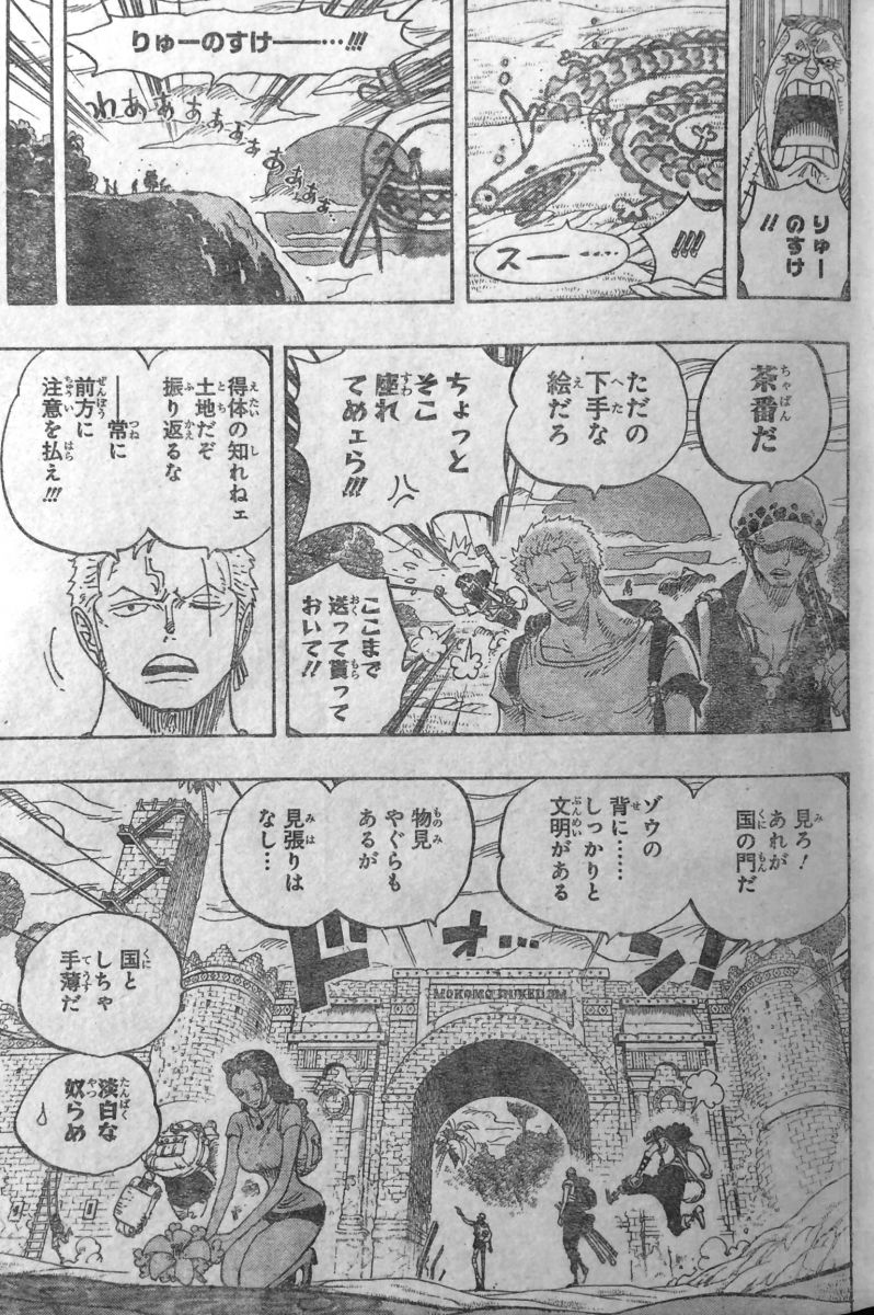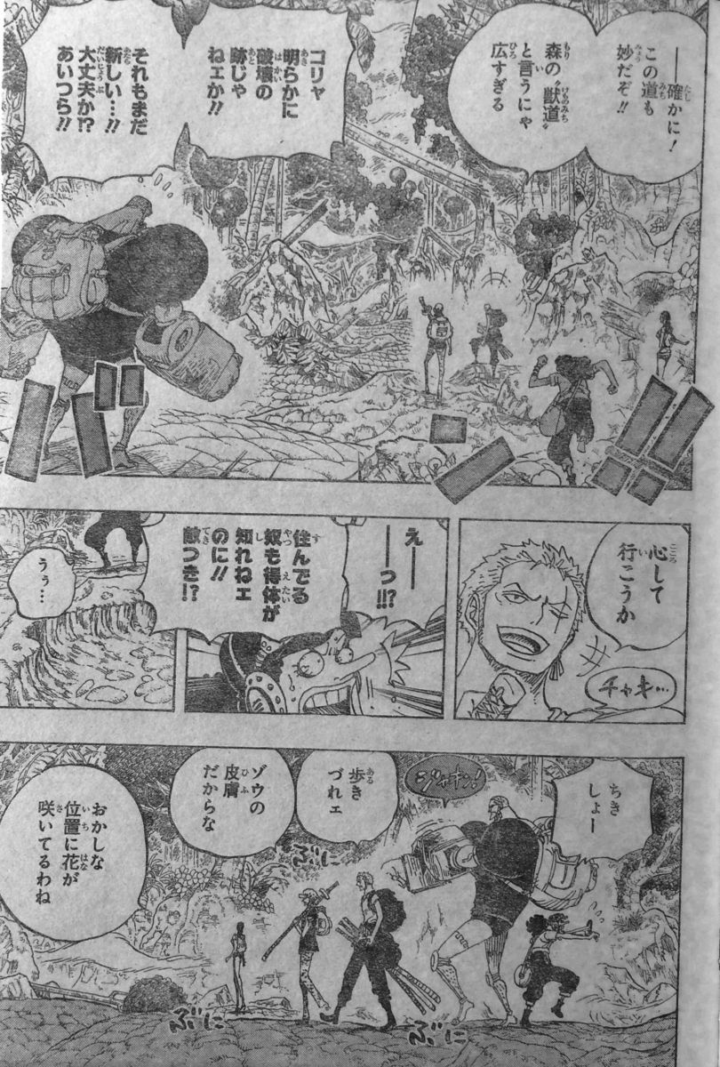 門は誰かにこじ開けられ、道や木も最近破壊された様子!象の皮膚は歩きづらく、ロビンは おかしな位置に花が咲いていると言います。ゾロ達を望遠鏡で監視している者は、バリエテはどうしたの!?レッサーミンクが門を素通り、やられちゃったのかも・・・!と言います。バリエテが降ってきた小猿の名前で、先程は自分で落ちてしまったのでしょうか??レッサーミンクとは人間の事でしょうか??街には人がおらず、建物は崩れています。かすかに火薬やガスの匂いもします。