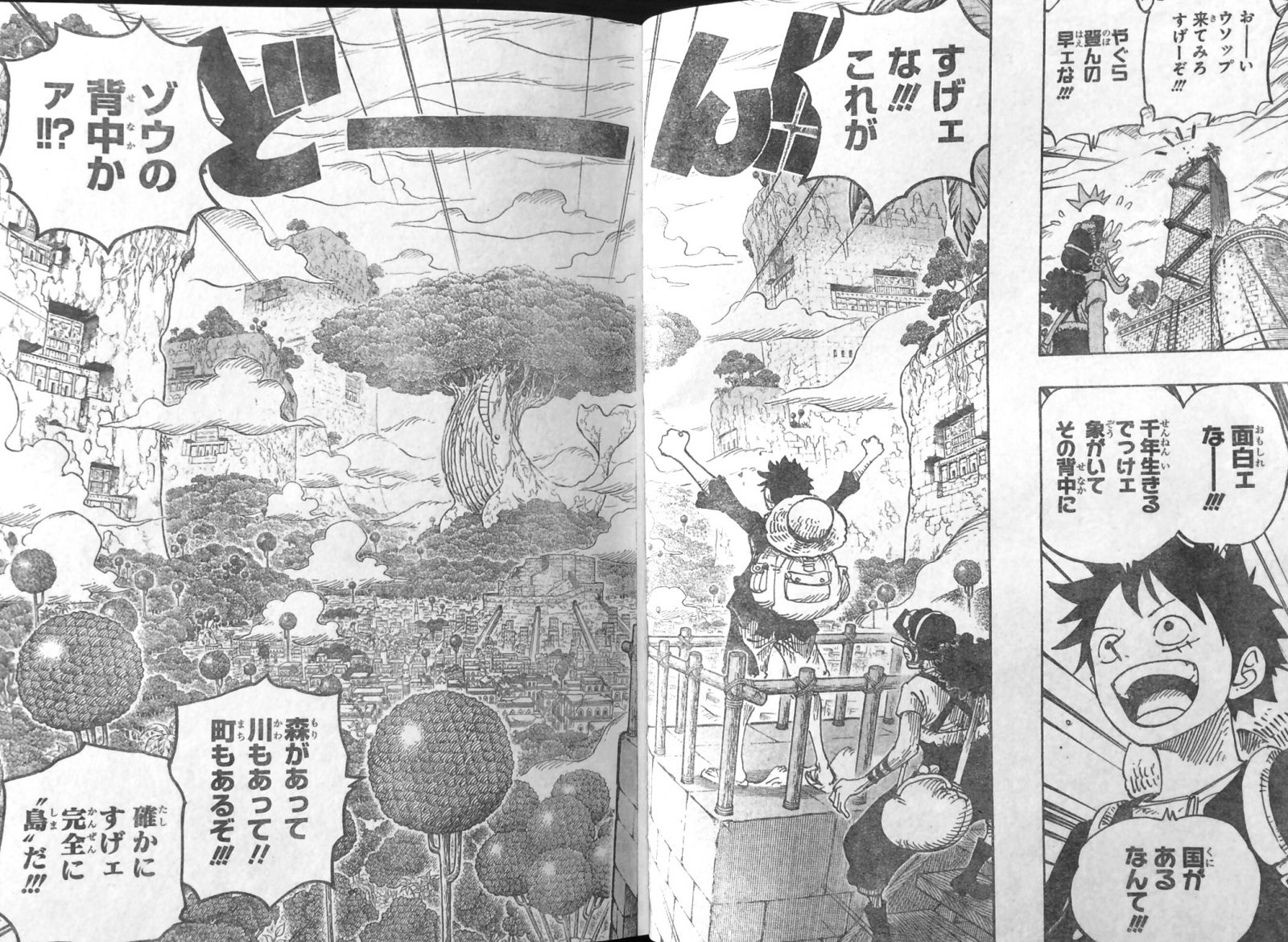 登象中のルフィ達の所へ降ってきたのは、服や帽子、靴を身に付け、エテテテと言っている小猿!誰かに落とされたのでしょうか。目隠しで遊んでいた錦えもんとカン十郎は小猿を避けられず、一緒に落下!見聞色の覇気で二人共無事だとわかり、竜が大変そうなので引き返せとは言えず、錦えもん達の言う通り ルフィ達は先に行く事に!勝手な入国は許さんぞという声も聞こえたので、小猿のものでしょうか。