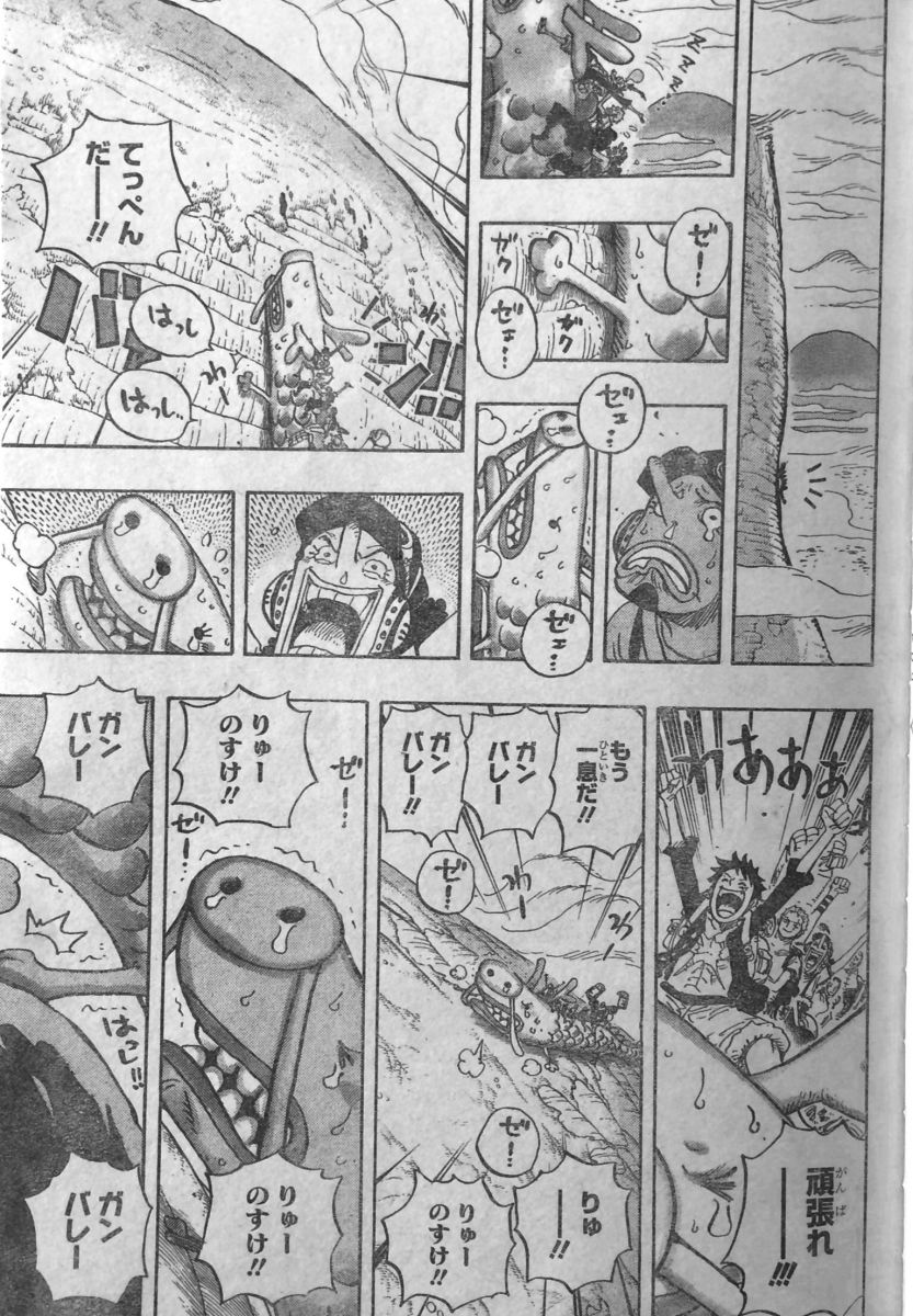 竜のりゅーのすけの頑張りで、ついにてっぺんに到着!役目を終えたりゅーのすけは絵に戻り、涙するフランキー達!淡白なローとゾロ!カン十郎のカキカキの実?フデフデの実?の悪魔の実の能力らしきもので描かれ実体化したものは、役目を終えたら絵に戻る仕組みなのでしょうか。