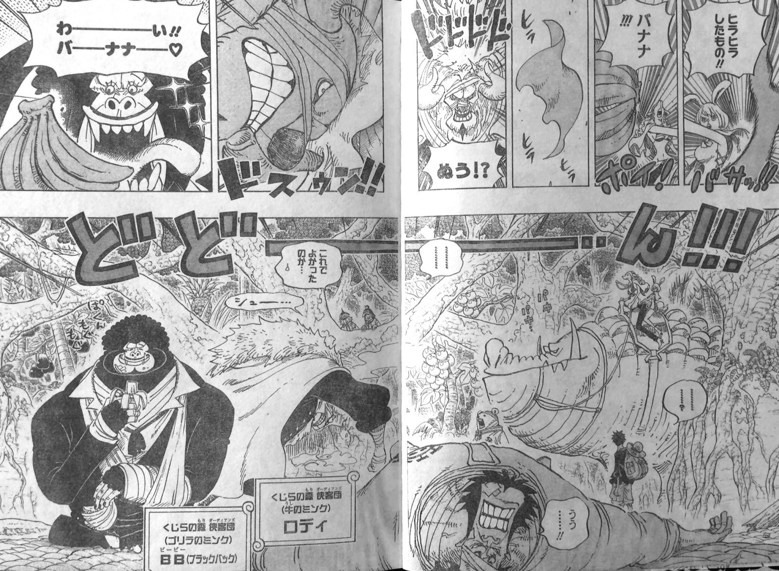 キャロット達が到着し、ヒラヒラした布とバナナを投げ、くじらの森 侠客団(牛のミンク)ロディが闘牛の様に布を追って木に串刺しにし、くじらの森 侠客団(ゴリラのミンク)BB(ブラックバック)がバナナを食べ、二人共収まりました!戦獣民族(犬のミンク)ワンダはルフィに抵抗するなと言います。キャロットも戦獣民族でうさぎのミンク!ワンダはルフィの顔を舐め、侠客団にすぐに連れ出す、許してくれと言います。
