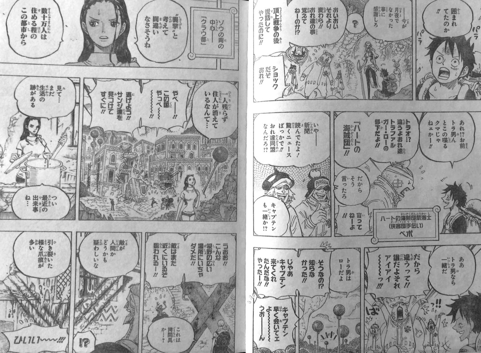 ゾウの背の中心クラウ都を観察するゾロ達!数十万人は住める程の都市から一人残らず住人が消えている事や、つい1〜2週間前まで生活の跡がある事、拷問具や巨大な爪痕や巨大な足跡がある事などから、1〜2週間前に突如国が滅びた事が分かりました!ルフィもワンダから、数百年の歴史あるモコモ公国がジャックに滅ぼされたと聞きます。