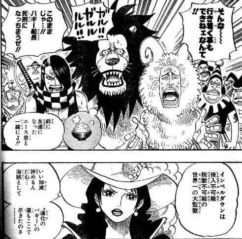 でも、インペルダウンの副署長が 道化のバギーが檻から消えたと 電伝虫で話しています!バギーはバラバラの実の能力で 脱獄したのかもしれません!バギー一味は以前エースと仲良くなったし、バギーとシャンクスは昔 海賊王ゴール・D・ロジャーの船に乗っていた仲だし、アルビダはルフィに好意を持っています。このままでは終わらなさそうな気配を感じますね!