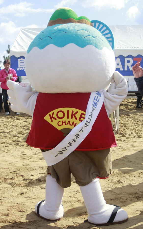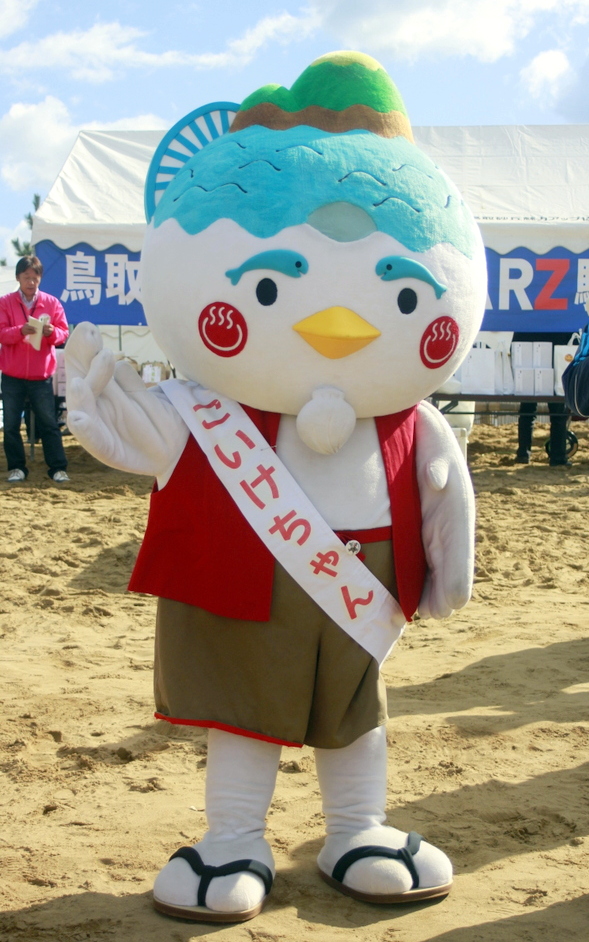 | 2013年4月誕生。日本最大の「池」である湖山池のマスコットキャラクター。 池に浮かぶ青島が頭の上にあり、池の魚がまゆ毛代わり。池周辺に伝わる民話の主人公「湖山長者」も表現している。 |