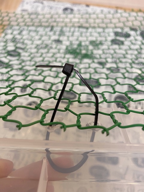 金網をフタに合わせて、穴から結束バンドで結んで固定。