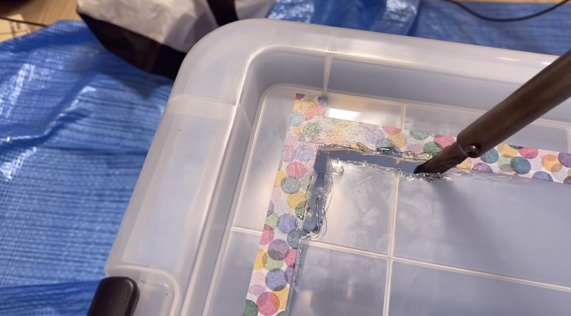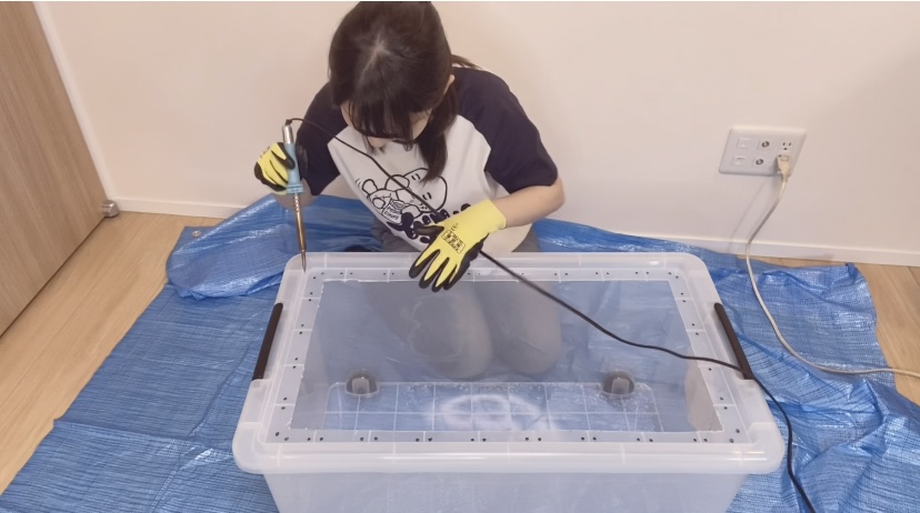 スミカッターで、金網をとめる穴を開けます。電熱でスポスポあいて、とってもラク!