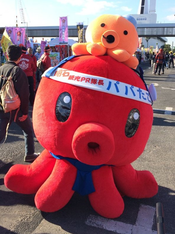 | 2000年に明石淡路フェリー通称「たこフェリー」のキャラクターとして誕生。熱血タコリーマンとして活躍。たこフェリー解散後は明石市がキャラクターを引き継ぎ、明石観光協会のキャラクターに転身。2016年6月に明石観光PR隊長に就任した。 タコ年齢40才、8人家族の大黒柱として日々奮闘中。 |