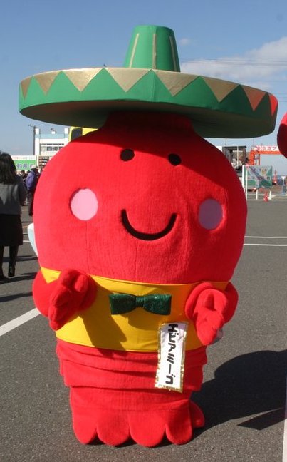 | 御宿町の地域特産物である「伊勢えび」と童謡「月の沙漠」のモデルとなった美しい海岸を体験するサーフィン、郷土が誇る400年前の史実により歴史的に交流の深い「メキシコ」の要素を併せ持つキャラクター。平成21年、国の「ふるさと雇用再生特別基金事業」により誕生した。 |