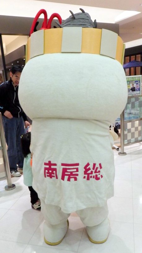 南房総市キャラクター。頭には新鮮な海産物を乗せ、手には特産品の房州びわを持っている。