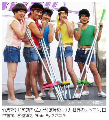 メンバーはナベアツ、「雨上がり決死隊」の宮迫博之(38)と蛍原徹(41)、「ココリコ」の田中直樹(37)、「ガレッジセール」のゴリ(36)の5人。寒空の下、ノースリーブのTシャツに短パン姿で登場。デビュー曲「LOVEなんだよ」(11日発売)のイントロが流れると、ナベアツを中央に、全員が竹馬に乗って熱唱。地味に動くことしかできないこっけいなパフォーマンスに、観衆も大爆笑だ。