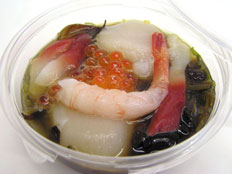 「七味海鮮丼」イクラ、ホッキ貝、ホタテ、甘エビ、キクラゲ、とびっ子、メカブの7素材を使った丼で、
