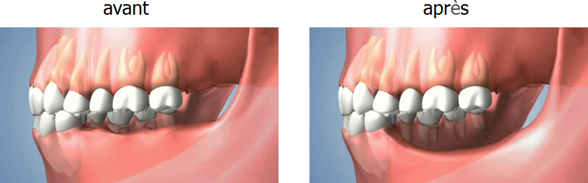 ●en cas d’espace édenté important, elle favorise la perte d’autres dents (celles de la mâchoire supérieure qui reposaient sur les dents manquantes du dessous, car elles ne bénéficient plus de leur soutien