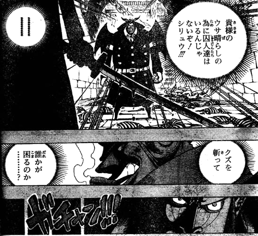 ここでLV.6“無限地獄”の存在が明確に!そしてほんの少し前なら、マゼランとほぼ同じ実力の“雨のシリュウ”という看守長がおり、インペルダウンはその2枚看板で鉄壁を誇っていた!シリュウは気の向くままに囚人達を大虐殺する為 危険人物としてLV.6に幽閉中ですが、その事実は政府によって抹消!LV.6には史上最悪の女囚カタリーナ・デボン、巨大戦艦サンファン・ウルフ、大酒のバスコ・ショット、クロコダイル、ジンベエ、エース等が幽閉中!