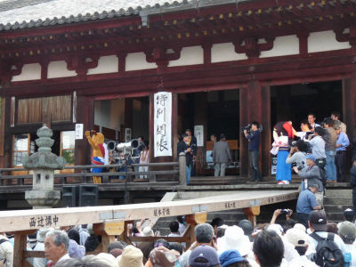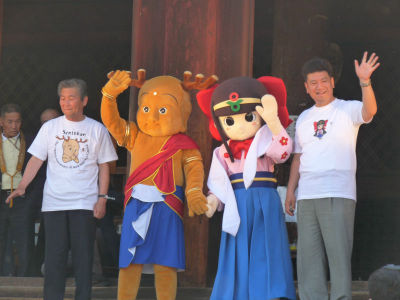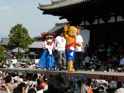 二人仲良く登場して来迎橋を渡り(来迎橋を渡っている最中は付き添いの人と手をつなぐ二人)、大勢の人のカメラに にこやかに手を振り、せんとくんが先に退場、葛城市マスコットキャラクターも後を追うように退場。