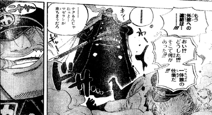 モニター室では 映像受信大電伝虫がやられ、獄内のモニターシステムが全て停止し 海軍本部・政府機関への連絡が不可能になったと報告している職員をシリュウが攻撃!黒ひげ側という事でしょうか?スカウトされ応じた!?