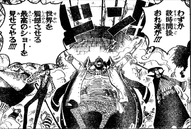 必ずエースを助けると言うルフィに、黒ひげが「ワンピースも必ず存在する」「わずか数時間後におれ達が世界を震撼させる最高のショーを見せてやる」と言いました!一体何をする気なのか!?黒ひげの一味は全員マゼランから毒竜をくらいましたが、きっと黒ひげは自身だけではなく一味全員のダメージを無効化できるのでしょう!