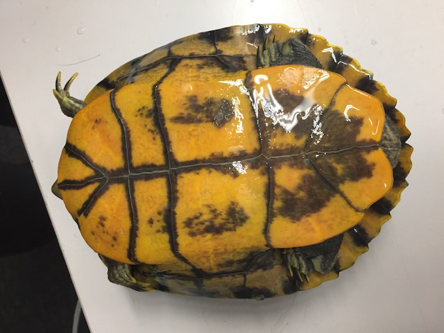 首の両側にある赤い模様がなく、甲羅は黄色でポツポツしたまだら模様。甲羅はまるでタイマイのよう。べっ甲に少し似た柄でした。