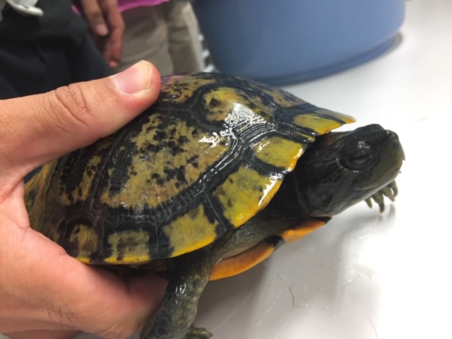 腹甲は、マスタードのような黄色にまだら模様。キバラガメでもなさそうです。