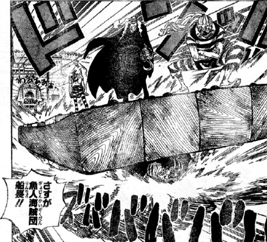 銃を構える海兵に、ジンベエが海から魚人空手 槍波!海兵だけではなく船の一部も吹っ飛びました!