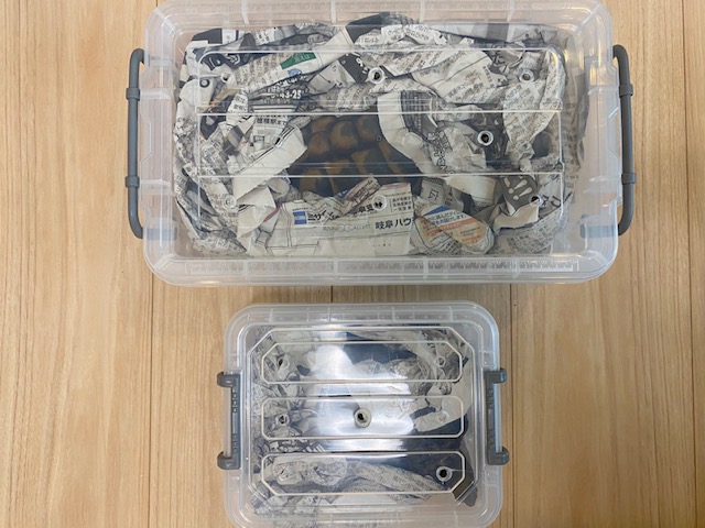 「適度に寒い、暗い、体に何か触れている状態」が、もっとも落ち着きます。身動きがとれる中途半端な広さがあると、ゴトゴト暴れてかなり体力を消耗します。新聞紙やキッチンペーパーを詰めて動きを封じます。