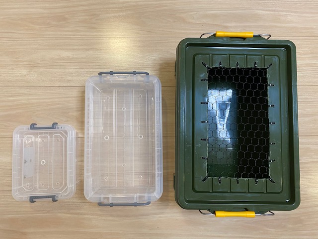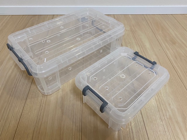 亀さんたちは結構怪力なので、普通のタッパーや容器では、フタを押し上げて出てきてしまいます。「フタを内側から開けられないタイプ」「頑丈」「管理がしやすい」ものを選びました。