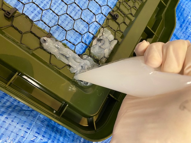 金網や結束バンドの尖った部分を、シリコンで塞ぎます。